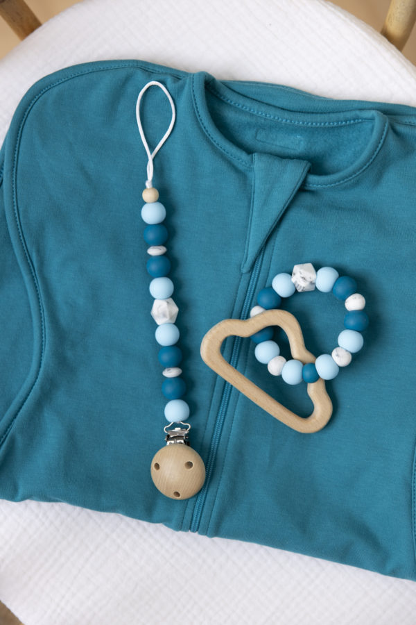 En collaboration avec le marque de combinaison évolutive TILOUCO nous avons créé une collection capsule d’attache- tétine et de hochet de dentition assortie à la marque de vêtement .